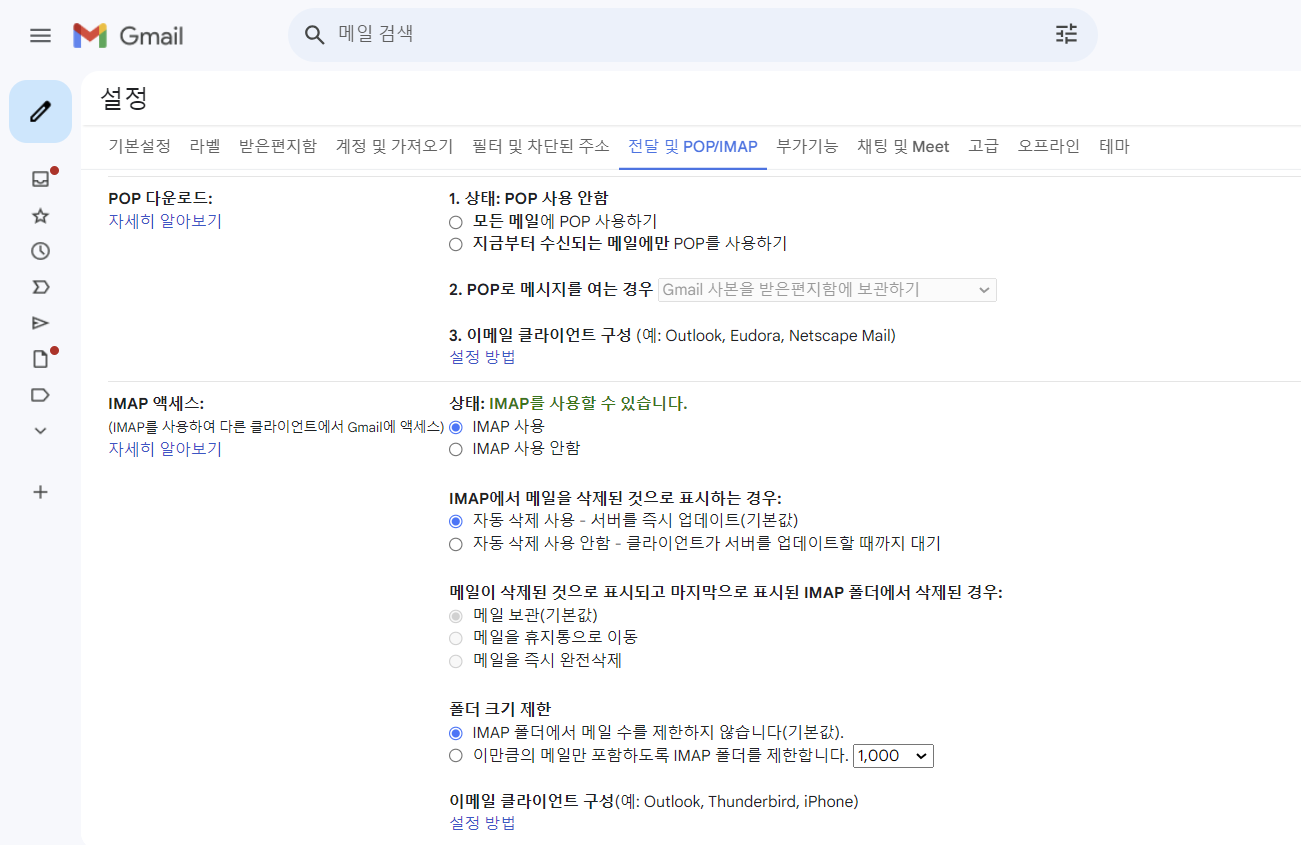 이후 [Gmail 설정 > 전달 및 POP/IMAP]을 아래 사진처럼 설정하면 Google SMTP와 관련된 모든 설정은 끝난다.