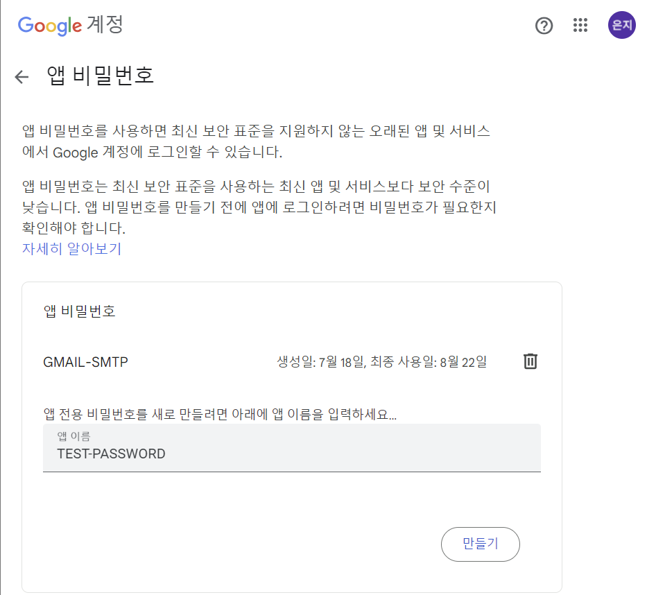 Gmail로 이메일을 보내기 위해 [Google 계정 설정 > 보안 > 2단계 인증 > 앱 비밀번호]에서 앱 비밀번호를 만들어야 한다.