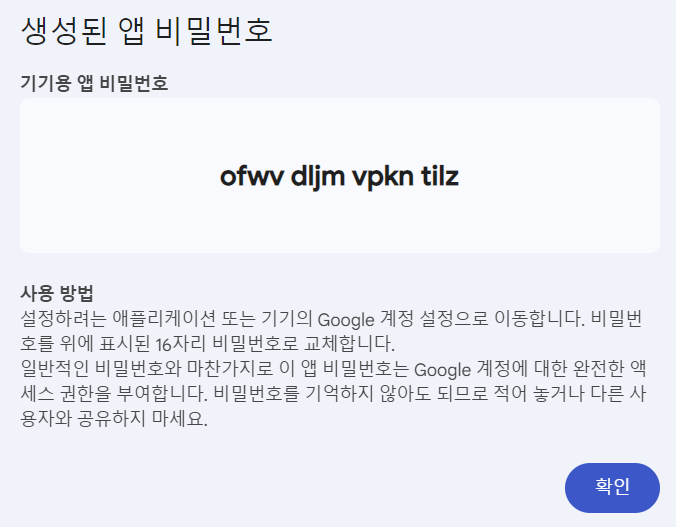 [만들기]를 클릭하면 아래와 같은 화면이 뜨는데, 이 화면이 꺼지면 따로 확인할 수 없기 때문에 16자리 비밀번호를 따로 적어놔야 한다. (보안 문서에 따로 적어두는 것이 좋다.)